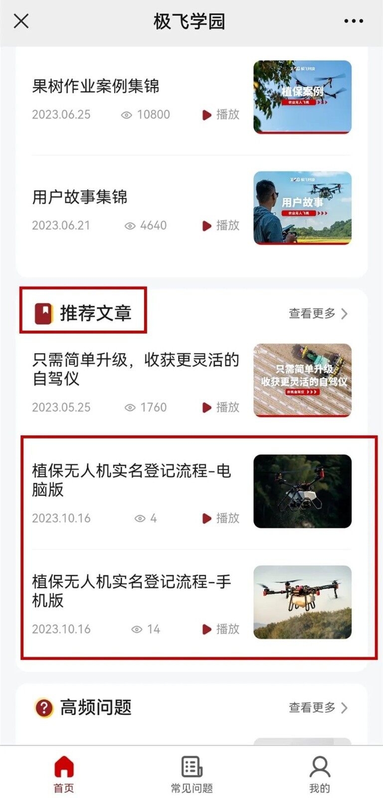 为了让大家更加清楚登记流程,极飞学园已经上线相关操作教程。在首页向下滑动,在“推荐文章”处即可点击查看。