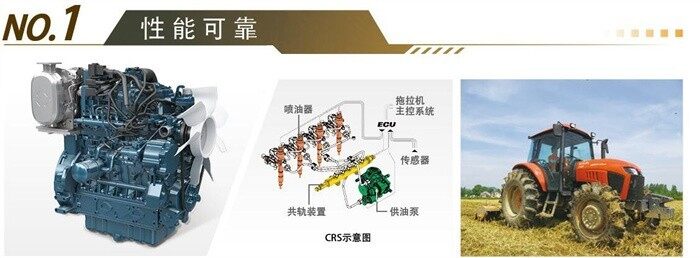 后处理方面采用了EGR(废气再循环)+DOC(催化转化器)+DPF(颗粒捕捉),配合优良的进气系统和精准的供油系统,使久保田拖拉机保证高功率输出的同时,达到了非道路国四的排放标准。