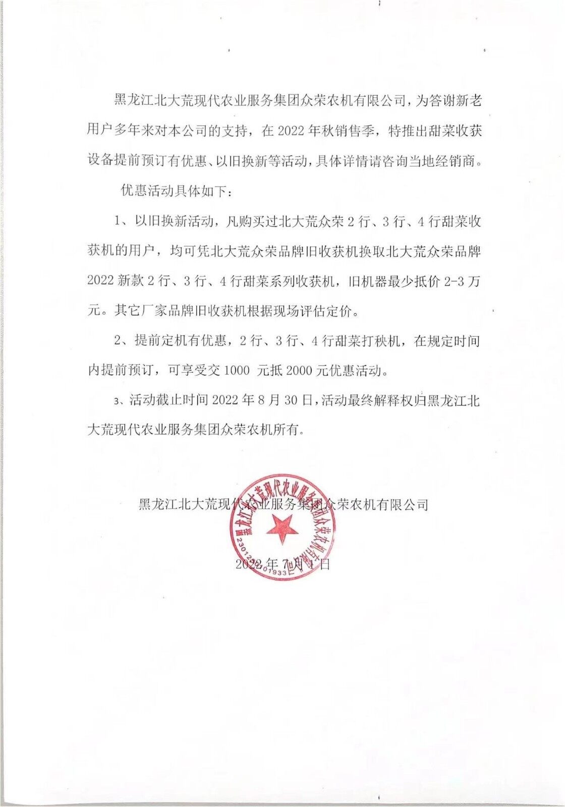 甜菜采收即将开始之际,黑龙江北大荒现代农业服务集团众荣农机(以下简称“众荣农机”)从7月份开始的以旧换新活动也即将在8月30日结束。