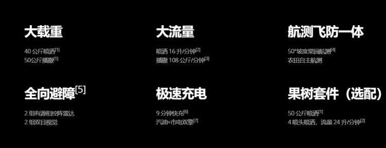 双重雾化喷洒系统,带来 16 升/分钟超大流量(2 喷头喷洒),雾滴均匀细密,无滴漏。针对果树作业,还可选配 50L 喷洒箱和增配一对离心喷头,流量可提升至 24 升/分钟(4 喷头喷洒),增加喷洒覆盖面积,有效提升作业效率和叶背药液附着率。