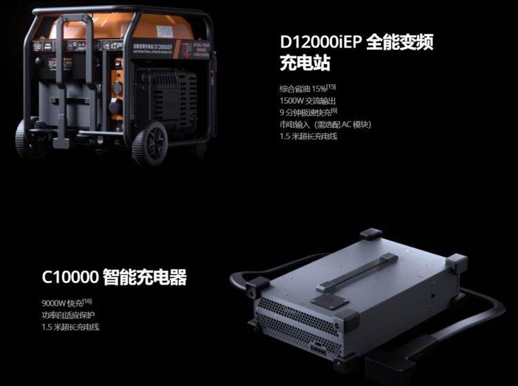 D12000iEP 全能变频充电站,延续电喷技术,有效省油 15%。DB1560 智能飞行电池,搭配风冷散热器,9 分钟极速快充[6]。充电模块可独立拆卸,满足市电、燃油充电需求[7]。