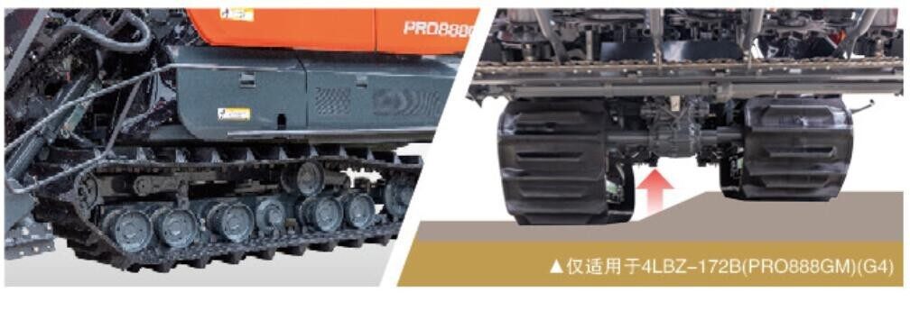52节、500mm宽、45mm齿高的高花履带,低接地压力,不损伤田块,烂田性能好。(※此处数据采用4LBZ-172B(PRO888GM)(G4))