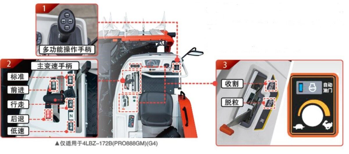 通过单根手柄可完成机体转向、割台升降及机体水平控制功能的操作。