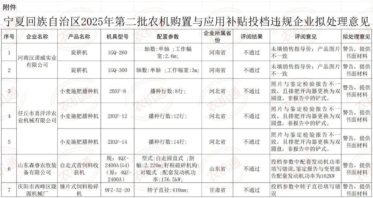 附件:宁夏回族自治区2025年第三批农机购置与应用补贴投档违规企业拟处理意见