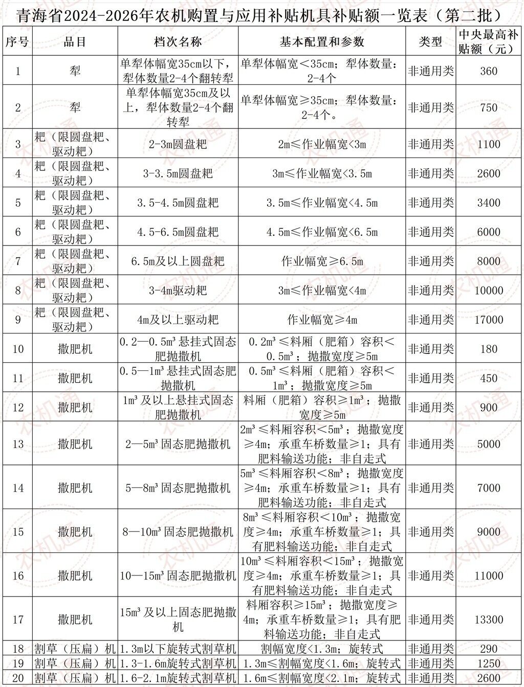 《2024-2026年青海省农机购置与应用补贴机具补贴额一览表(第二批)》的通知