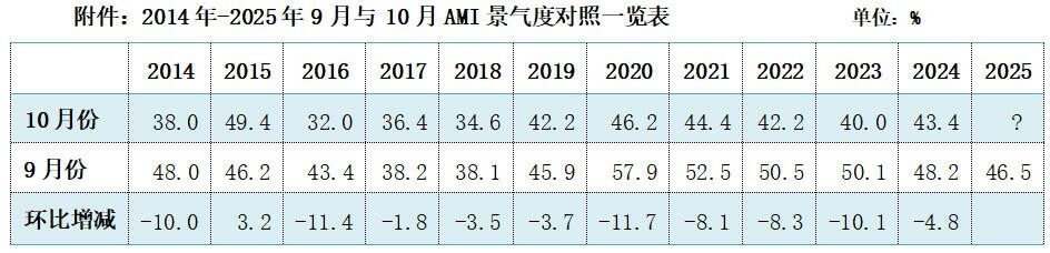 9月份AMI指数为46.5%,比上月下降9.4个百分点,比上年同期下降1.7个百分点。