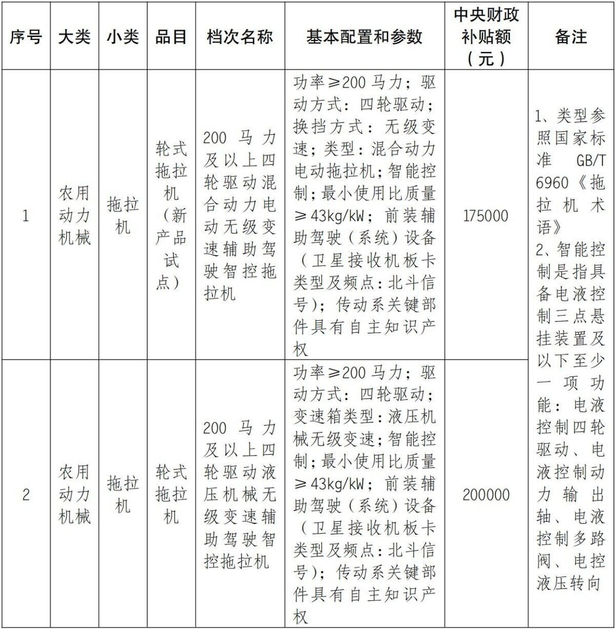 根据农业农村部办公厅、财政部办公厅《关于印发〈2024-2026年农机购置与应用补贴实施意见〉的通知》(农办机〔2024〕3号)和“优机优补”等文件要求,结合我省农业生产需要,经测算评审、会议审定等工作程序,形成了《陕西省200马力及以上无级变速高端智能拖拉机购置与应用补贴机具补贴额一览表》(见附件),现予以示。