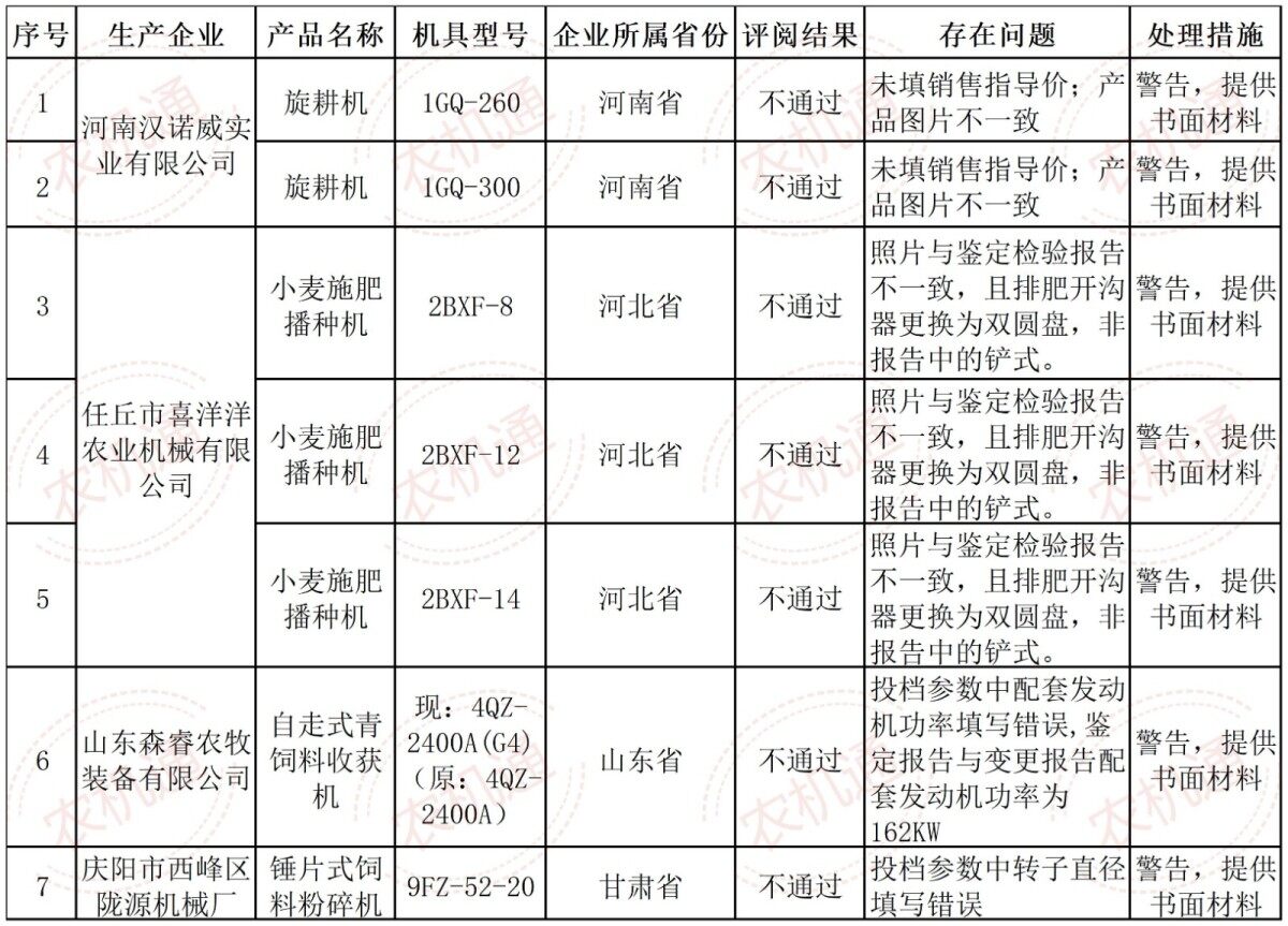 根据《农业部办公厅财政部办公厅关于印发〈农业机械购置补贴产品违规经营行为处理办法(试行)〉的通知》(农办财〔2017〕26号)《农业农村部办公厅财政部办公厅关于进一步加强农机购置补贴政策监管强化纪律约束的通知》(农办机〔2019〕6号)的有关规定,我厅组织专家对2025年第三批农机购置与应用补贴投档违规行为进行调查核实,并采取书面约谈的方式告知。经研究,决定对第三批农机购置与应用补贴投档的4家企业7类产品存在违规行为进行通报,详情见附表。