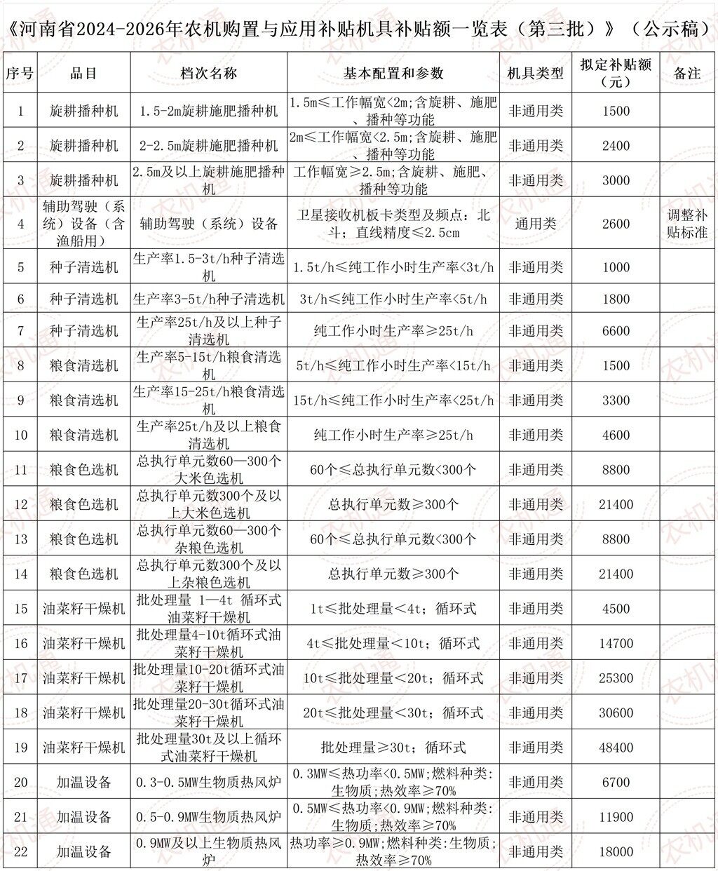 河南省2024-2026年农机购置与应用补贴机具补贴额一览表(第三批)公示