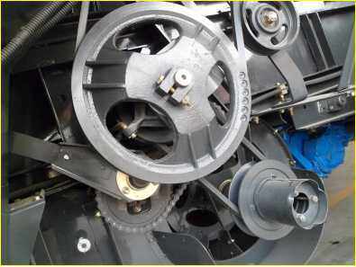 可便捷的调整滚筒转速,从而使滚筒实现从550转到1100转的转速调整,以适应收获不同作物的转速要求