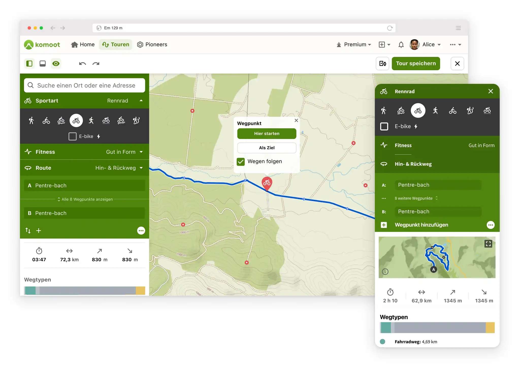 Wenn du lieber dein eigenes Abenteuer planst, macht komoot dir auch das einfacher. Egal ob glatter Asphalt für dein Rennrad, Singletrails für dein Mountainbike oder einsame Wege für deine Wanderungen, komoot generiert die passende Route – maßgeschneidert für dein nächstes Outdoor-Erlebnis. Pass Touren ganz einfach an und plan Orte ein, an denen du unterwegs vorbei kommen möchtest. Dann schau dir an, wie die Wege und Oberflächen sein werden, Meter für Meter. So weißt du immer was kommt, egal wo dein Abenteuer dich hin bringt.
