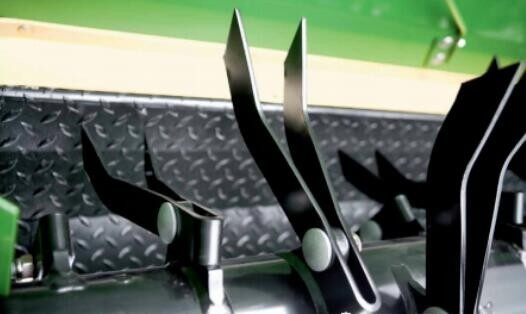 收获过程中机械的效率固然重要,但要收获高质量的饲料不能光依赖机械的高效性。机械的构造和细节设计往往能在很大程度上影响所收获的饲料质量。科罗尼公司CV系列机械的V形锤片不但能够有效的抽击割倒的草料,还能在整个刀梁宽度内使其均匀的分布。分布均匀的物料可大大缩短其晾干过程,为用户节省了宝贵时间,又能最大程度的避免饲料的养分流失。