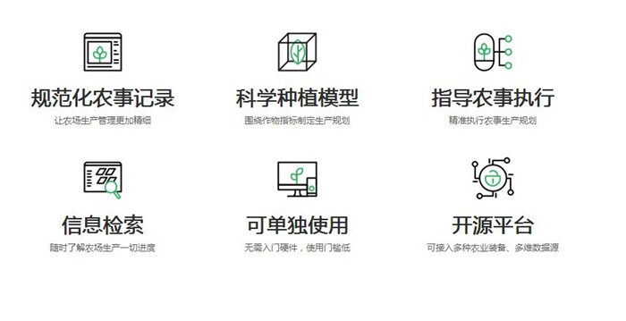 开放应用接口,支持第三方接入,支持物联设备、智能农机、农业自动驾驶仪、控制阀、水位传感器等多种农业装备,通过感知与精准农业任务执行将物理信息数字化,提供多维数据源。