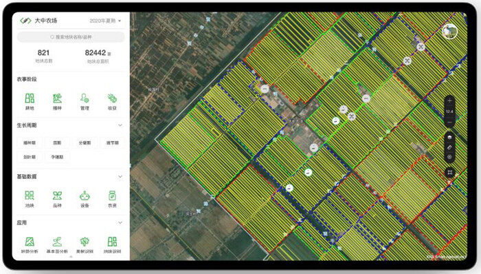 基于 GIS 可视化地图,选择作物种植季,通过生产规划、作物模型、生产资料等按钮,可快速了解全局信息,纵览你的农场。以地块为元数据,一地一码,点击即可进入地块,了解详情。