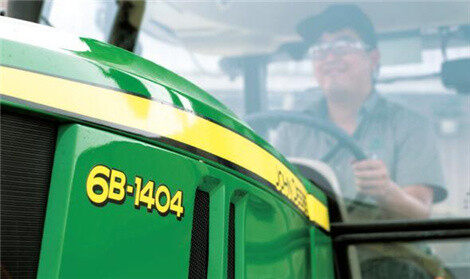 约翰迪尔6B系列拖拉机包含马力段95-140马力,配备约翰迪尔PowerTech发动机, 1404 6缸机扭矩储备高达35%。性能卓著的约翰迪尔变速箱。标配12个前进挡4个倒退挡, 120马力以上机型可选装24x8高低速动力换挡变速箱。 1204,1404机型豪华版机型配有24个前进挡12个倒退挡,还标配动力前后换挡机构,无需踩离合,只需手柄即可切换行驶方向,流畅省时。该系列拖拉机采用了全新整体式引擎罩;整体式大面积进气格栅,保证了便利的维护。后悬挂包括双外置提升油缸,可在提高提升能力的同时降低维护时间和成本。宽敞舒适的驾驶室视野佳,密封性能好,噪音低。高挡坐椅,可方便进行水平及舒适度调节。 1204, 1404豪华机型更有可调角度、长度方向盘,舒适性更进一步。豪华、高配和舒适机型配有空调暖风。豪华、高配和舒适机型在17年均增加两组前工作灯,保障了驾驶员夜间工作的安全性和作业效率。 6B系列拖拉机采用了PowerCore空滤系统,过滤效果更好,更高效提升20%空气流通容量,且无需工具即可方便的维护。 1404六缸机型将油箱容积提高到255升,效率的飞跃,显而易见。 1404六缸机标配湿式离合,寿命长达1万小时。