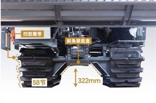 采用结构优化的斜角梁底盘结构,离地间隙高达322毫米,配套58节高花凹型履带,可确保烂田作业时底盘不易雍泥,烂田通过性好。另外,底盘结构设计优化后,机器上下坡安全可靠,轻松过田埂。