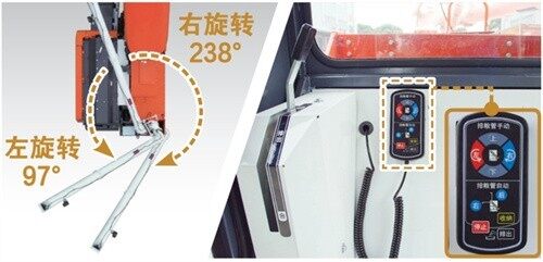 ■卸粮筒可从左、右方向旋出,具有手动及自动(右、后两点)双模式旋出功能,同时具备一键收纳功能,同时提供手动卸粮模式。