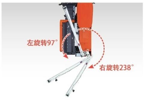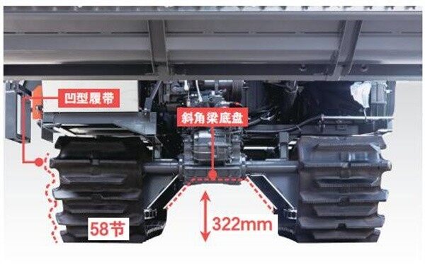 采用结构优化的斜角梁底盘结构,离地间隙高达322mm,配套58节高花凹型履带,可确保烂田作业时底盘不易雍泥,烂田通过性好。另外,底盘结构设计优化后,机器上下坡安全可靠,轻松过田埂。