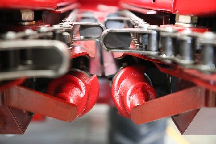- 割台专利技术,采用新型对刀拉茎式摘穗箱及新型割台体,拉茎速度快,摘穗效果好;采用专用扶持器,强制喂入,更加适合收倒伏玉米,收获效率高。
