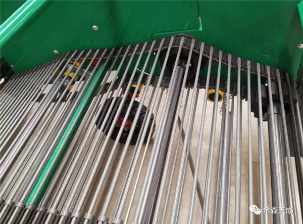 前输送是由50mm节距梅花橡胶轮在变速箱动力输入的作用下带动前输送分离筛。 后输送是由45mm节距的梅花橡胶轮在变速箱动力输入的作用下带动后输送分离筛,后输送是在原来的位置增加了向下输送的胶轴,减小薯块落地高度。梅花橡胶轮与输送分离筛啮合好,磨损轻,寿命长;这种型式的输送分离筛使用可靠,马铃薯破损少。抖动轮可抖动输送分离筛,提高马铃薯与土壤的分离能力。输送杆穿杆由原来φ10改为φ11,增加穿杆的磨损强度。连接铰链里面的隔套采用防转动装置,减小对铰链的磨损,是输送筛转动过程中隔套不磨铰链,只有穿杆与衬套相磨擦,易损件改为穿杆和衬套,更换方便。