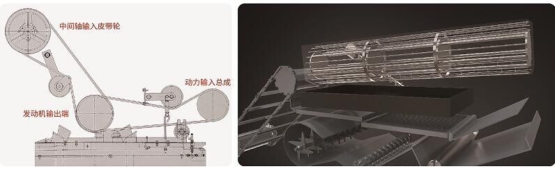 脱粒滚筒采用三根钉齿三根纹杆,皮带轮直径加大,传动效率提升22%。