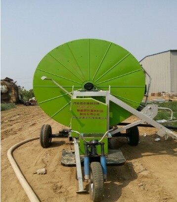 过滤处理的水通过快速接头或软管道进入圆盘转动塑管,期间电瓶驱动电机转动卷盘,卷盘转动且利用圆盘上的塑管带动双臂拖管移动式水肥灌溉一体机缓慢向前移动。移动速度可用电机转速调节。